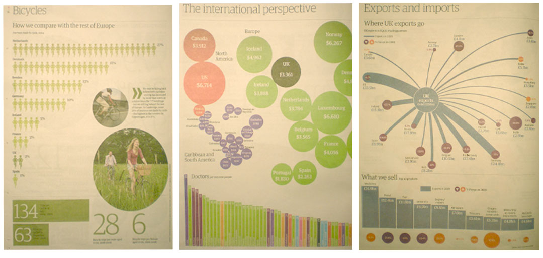 The guardian has published excellent supplements this week on the UK FACTFILES from ECONOMY – ENVIRONMENT and TRANSPORT – HEALTH – POLITICS. The graphics are taken form statistical information based on values over a wide range of subjects and issues. Graphics are simple but very bold which provide immediate visual impact.